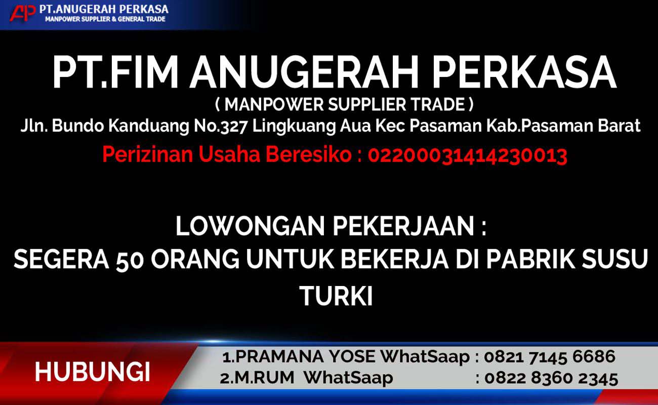 PT. FIM Anugerah Perkasa adalah perusahaan resmi Penyalur Pekerja Migran Indonesia (PMI) yang membantu menghubungkan WNI dengan peluang karier profesional di luar negeri, fokus ke negara-negara di Asia dan Eropa dengan gaji tinggi, termasuk ke Turki, menawarkan legalitas terjamin dan pengembangan diri bagi para pekerja migran. Perusahaan ini terdaftar resmi di SISKOP2MI dan memiliki izin resmi, memastikan proses penempatan sesuai aturan pemerintah.